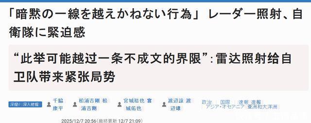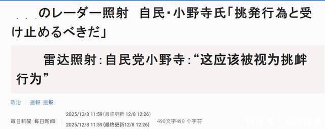 针对日本战机的滋扰中国海军歼-15战斗机亮剑使用雷达照射的方式对日方进行警告不是一次而是两次。但是日方并没有吸取任何教训在歼-15亮剑后在日方在2025年12月7日提出首次提出所谓“抗议”不到24小时在2025年12月8日日本再发战争威胁 来自日本自民党的政策调查会长小林孝之称“这是极其危险的行为绝对不可接受”。而日本国家安全保障调查会长小野寺五典指出“毫无疑问事态已显著升级朝着危险的方向发展。这应被视为挑衅行为。”